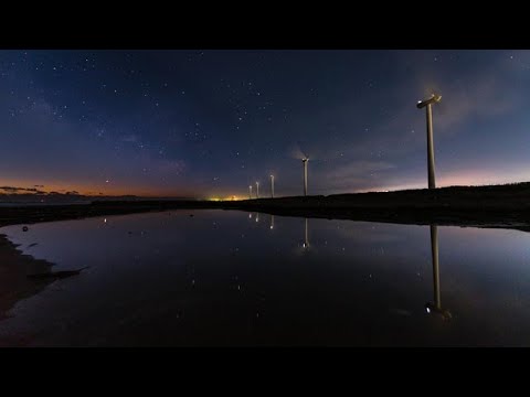 風車が絵になる海岸、日川浜(千葉茨城の県境波崎に程近い海岸)で風車を前景に天の川と日の出を撮影