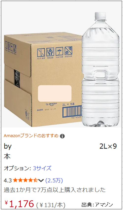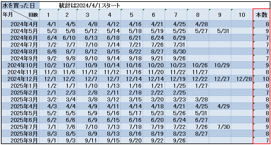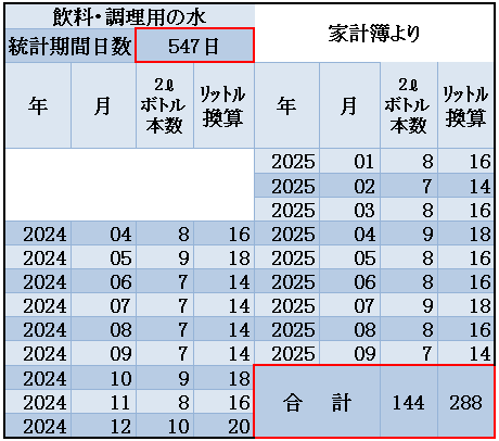 - 飲料・調理用にドラッグストアで買った2ℓボトルは144本、288ℓ