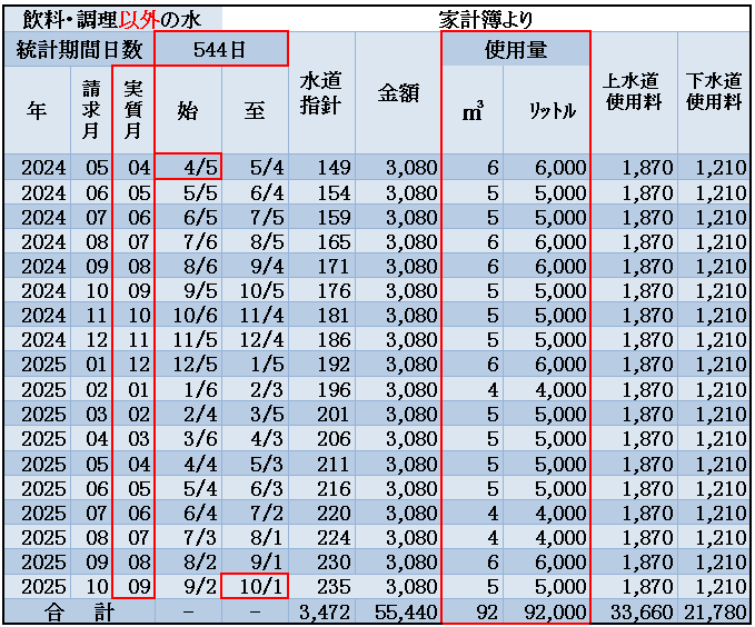- 288ℓ÷547日=0.53ℓ つまり飲料用として1日0.53ℓ使用した訳です