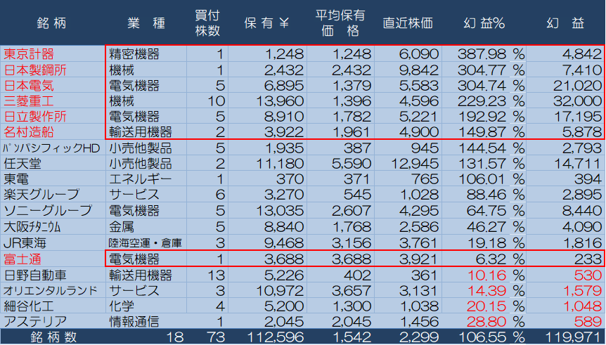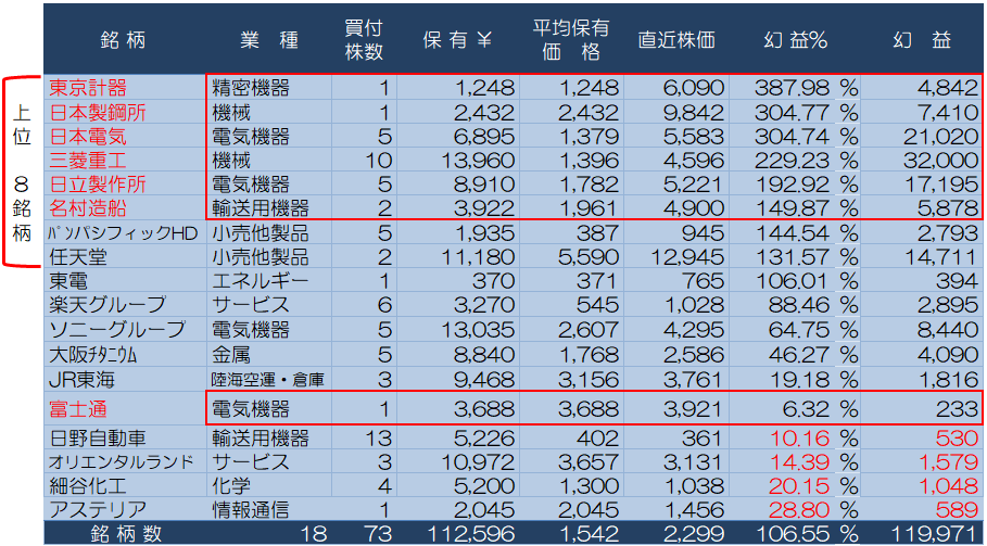 赤色外枠の8銘柄への投資額51,170円に対し評価額160,250円で2.96倍、プラス額は106,080円 少額ながらもトップは東京計器の4.87倍でした