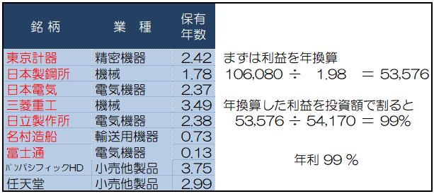投資額54,170円、プラス106,080円、平均保有年数1.98