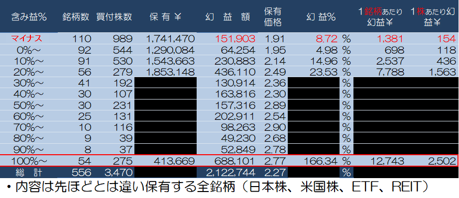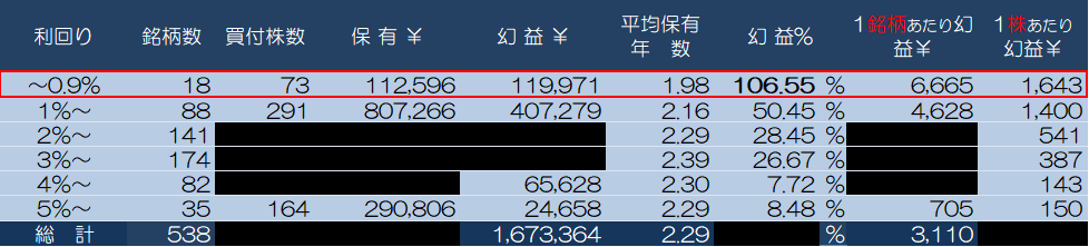 金額では黒塗り部分が大きいものの、銘柄あたり幻益(含み益)では利回り1%未満の18銘柄が6,665円でトップ、「高配当銘柄のパフォーマンスがいいのでは」っていう予想とは違い意外した
