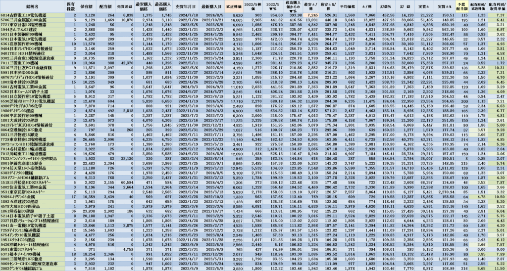 結果は必ずしも高配当株が上位ではなかった訳ですが、100%以上のパフォーマンス54銘柄一覧を普段は売買判断に利用している管理画面のスクショで紹介します